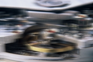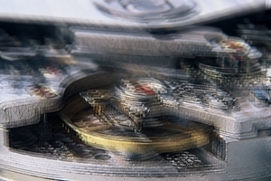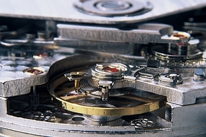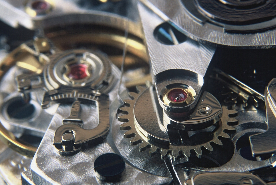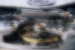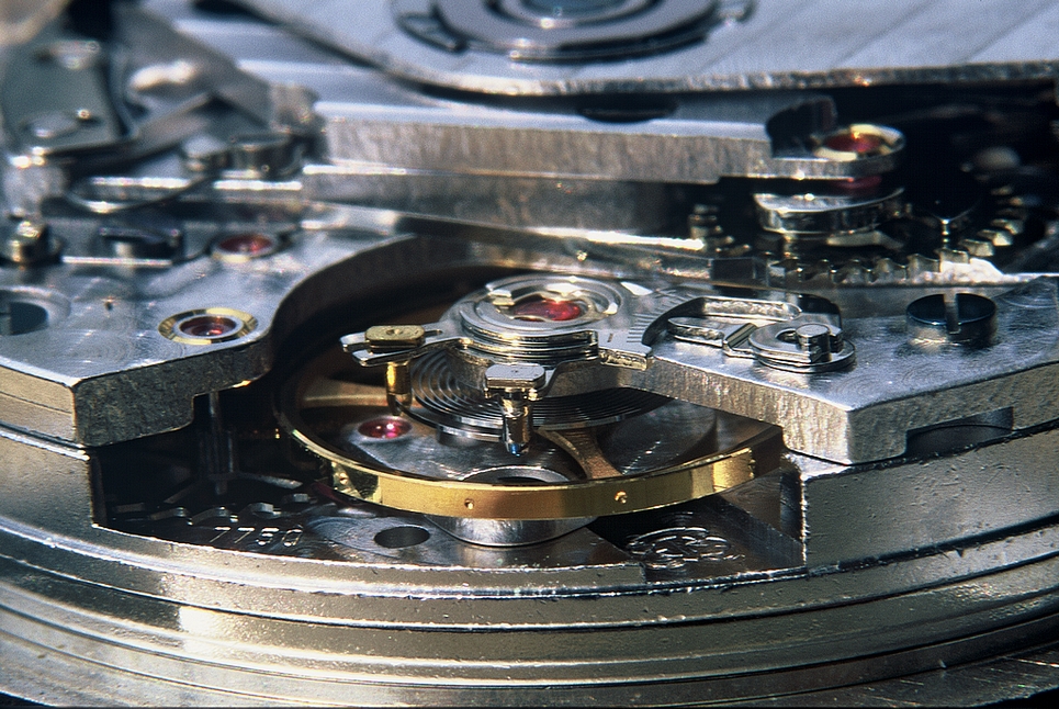 et balancier à gauche, Coeur de roue compteuse des minutes du chrono, avec à sa gauche et le ressort donnant la fonction sautante de la minute, à l'extrème-droite le marteau de remise à zéro. |