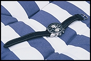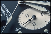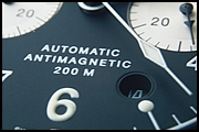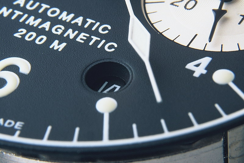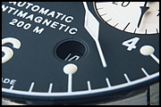 toute la place de ce grand rayon. Du fait de sa pastille luminescente, la trotteuse est équipée d'un balourd assez important à l'opposé de la pastille. Dessiné sans faute de goût. La date est calée dans un guichet, pratiquement un puits, très profond. L'avantage est sa grande discretion, les chiffres étant de plus petits. Il faut par contre faire l'effort d'être centré dessus pour lire facilement. |