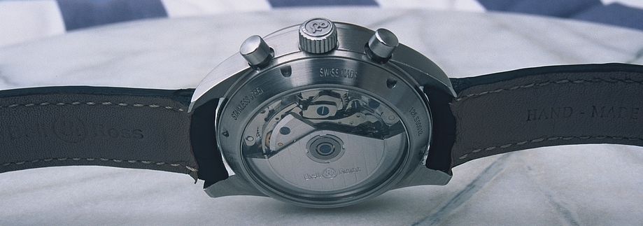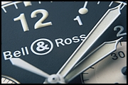 donne un relief au cadran incomparable. Le logo Bell & Ross. Associé aux données techniques en bas de cadran, il assoit totalement la parfaite symétrie de la montre. |