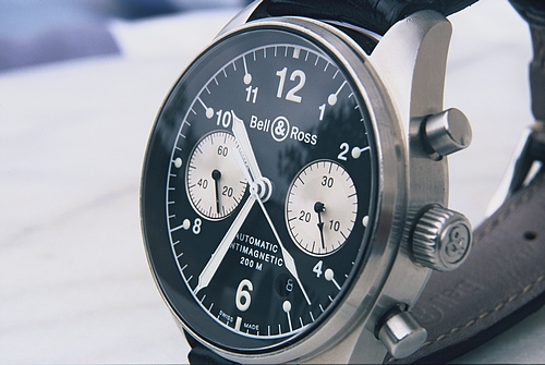 Bell & Ross Vintage 126 Une Belle de plus. Attendue depuis deux ans. La première fois que j'ai vu cette montre, c'était au bras de mon horloger. Elle me paraissait trop aboutie pour pouvoir m'être accessible, trop habillée, trop classe. Je venais de craquer pour la Space 3. Les temps sont passés, l'envie de chronos techniques peu à peu estompés, de même que les cadrans complexes. Les QP, phase de Lune et autre complications passaient comme le vent. Restait un un standard, deux compteurs, parfaitement symétriques. Certes, cette Vintage ressemble à beaucoup de montres plus anciennes, Dodanes, Vixa ... Elle n'invente pas un nouveau canon esthétique, mais elle en abouti le concept ! J'ai loupé une première occasion, elle venait trop